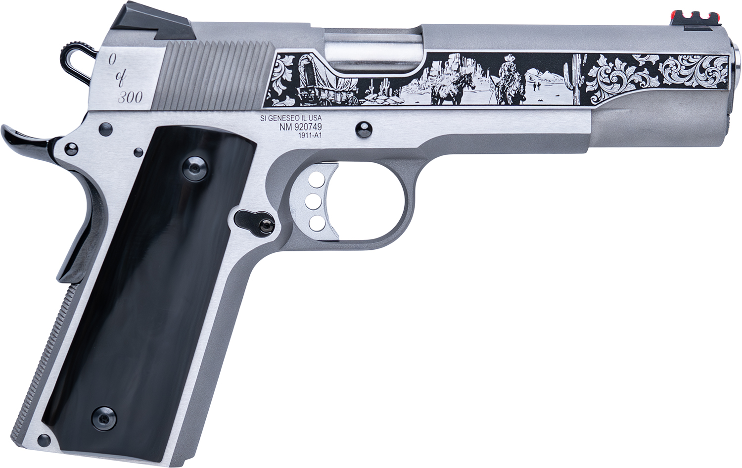 Cnc Firearms CNCWESTSPIRIT Colt 1911 Western Spirit 45 ACP 7+1 5″ Stainless Steel Barrel, Serrated w/Engraved Scrollwork Slide, Black Buffalo Horn Grip